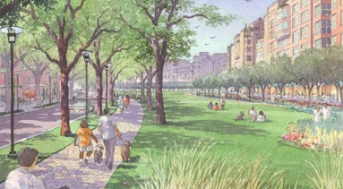 The Long Island Sound waterfront master plan transformed 80 acres of industrial brownfield into five mixed-use neighborhoods based on a network of connected open spaces. The site is located on a peninsula south of I-95 within walking distance to the multimodal transportation center in Downtown Stamford. The development included 2,500 residential units, 350,000sf of commercial office, 60,000sf of retail and a 250-room boutique hotel.